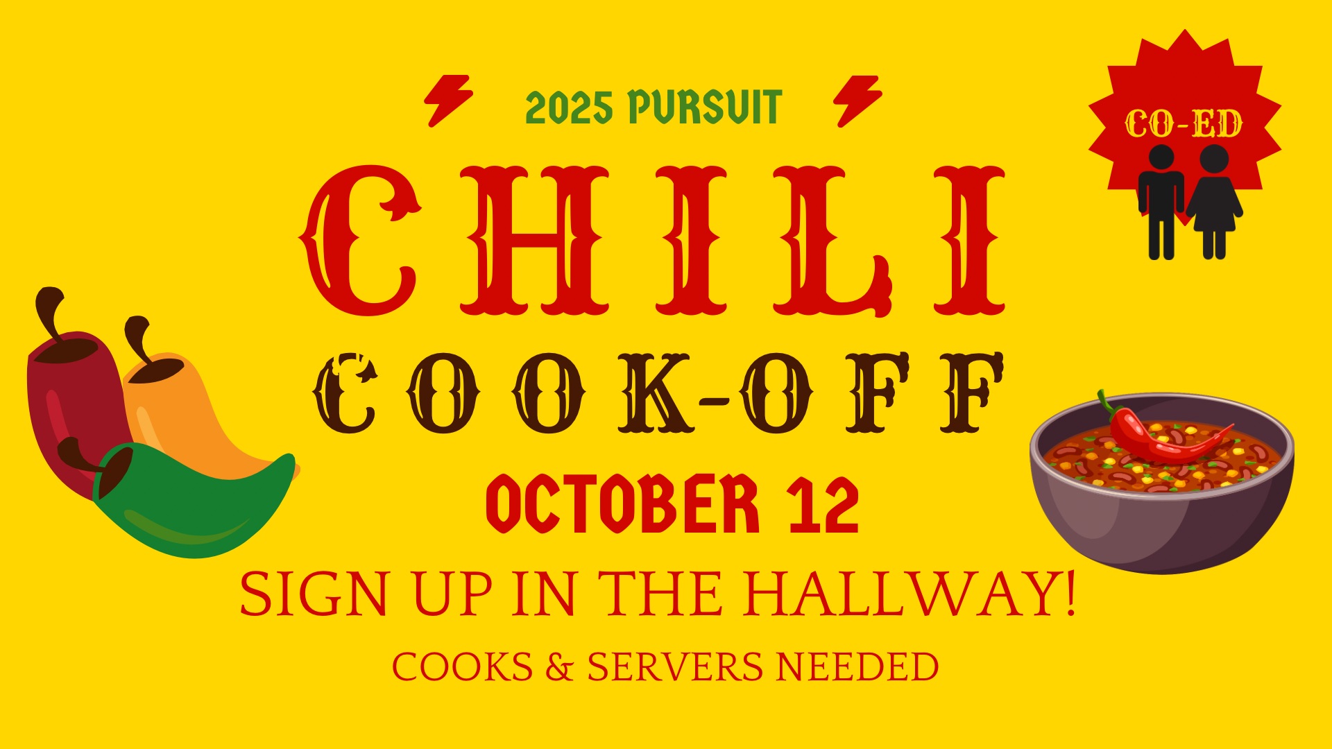 Annual Chili Cook-Off Join us after Service on Sunday, October 12th for our annual Chili Cook-off! + Add to Google Calendar + iCal / Outlook export 00 days 00 hours 00 minutes 00 seconds Date Oct 12 2025 Time 11:45 am - 12:45 pm Share this event